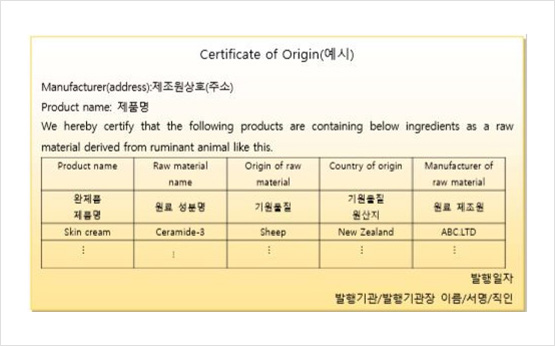 BSE미감염증명서 TSE(BSE)에 미감염되었음을 증명하는 서류로서 식약처장이 지정한 국가산 반추동물(소,양,염소 등)유래물질 사용원료 포함시 ※식약처장이 지정한 특정위험물질유래품목18개 부위 금지 BSE비사용증명서 반추동물 유래물질을 사용하지 않고 타동물이나 식물 또는 화학적 합성에 의한 원료임을 증명하는 서류로서 식약 처장이 지정한 (BSE 대상품목란 기재) 원산지증명서 당행 품목에 사용된 동물의 원산지를 증명할 수 있는 서류로서 식약처장이 지정한 국가 이외의 국가산 반추동물 유래품목 포함시 발행 |