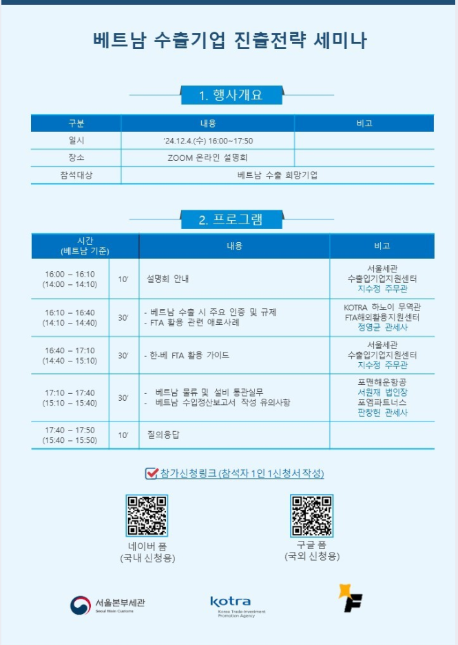 내용 : 베트남 진출기업을 위한 FTA 활용, 베트남 수출 시 주요 인증 및 규제, 물류 등 통관 실무