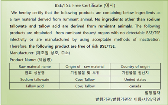 BSE미감염증명서 TSE(BSE)에 미감염되었음을 증명하는 서류로서 식약처장이 지정한 국가산 반추동물(소,양,염소 등)유래물질 사용원료 포함시 ※식약처장이 지정한 특정위험물질유래품목18개 부위 금지 BSE비사용증명서 반추동물 유래물질을 사용하지 않고 타동물이나 식물 또는 화학적 합성에 의한 원료임을 증명하는 서류로서 식약 처장이 지정한 (BSE 대상품목란 기재) 원산지증명서 당행 품목에 사용된 동물의 원산지를 증명할 수 있는 서류로서 식약처장이 지정한 국가 이외의 국가산 반추동물 유래품목 포함시 발행 |